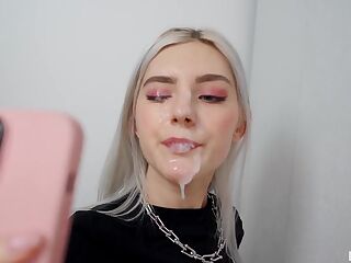 Une jeune fille de 18 ans prend sa joue, première pipe inoubliable